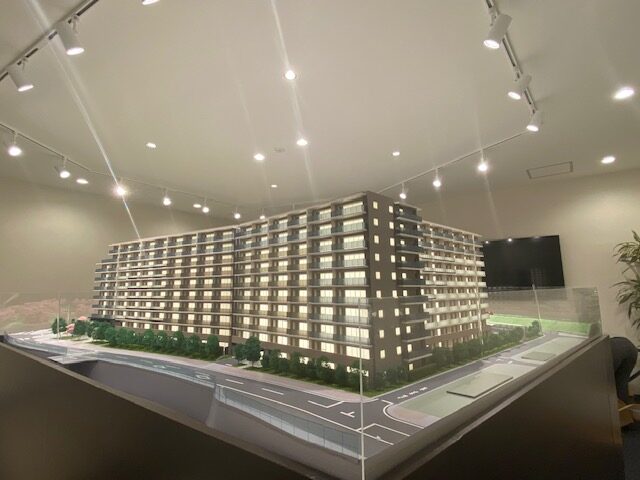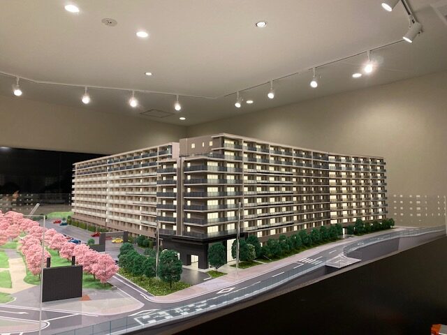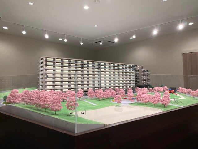 模型製作範囲は桜並木の立地を活かす設計とし、公園の遊具も具現化しマンション生活をイメージできるように造り上げました。