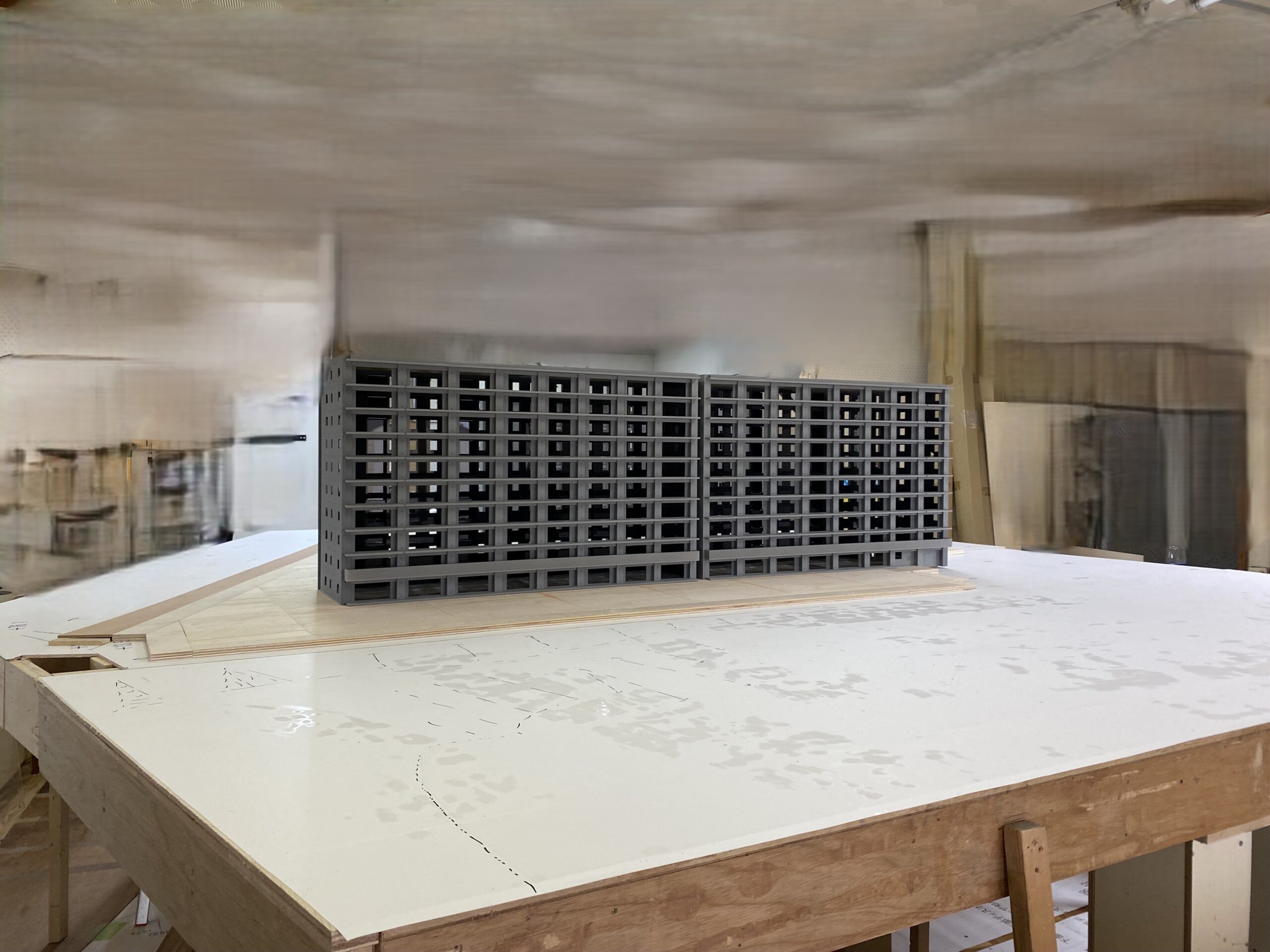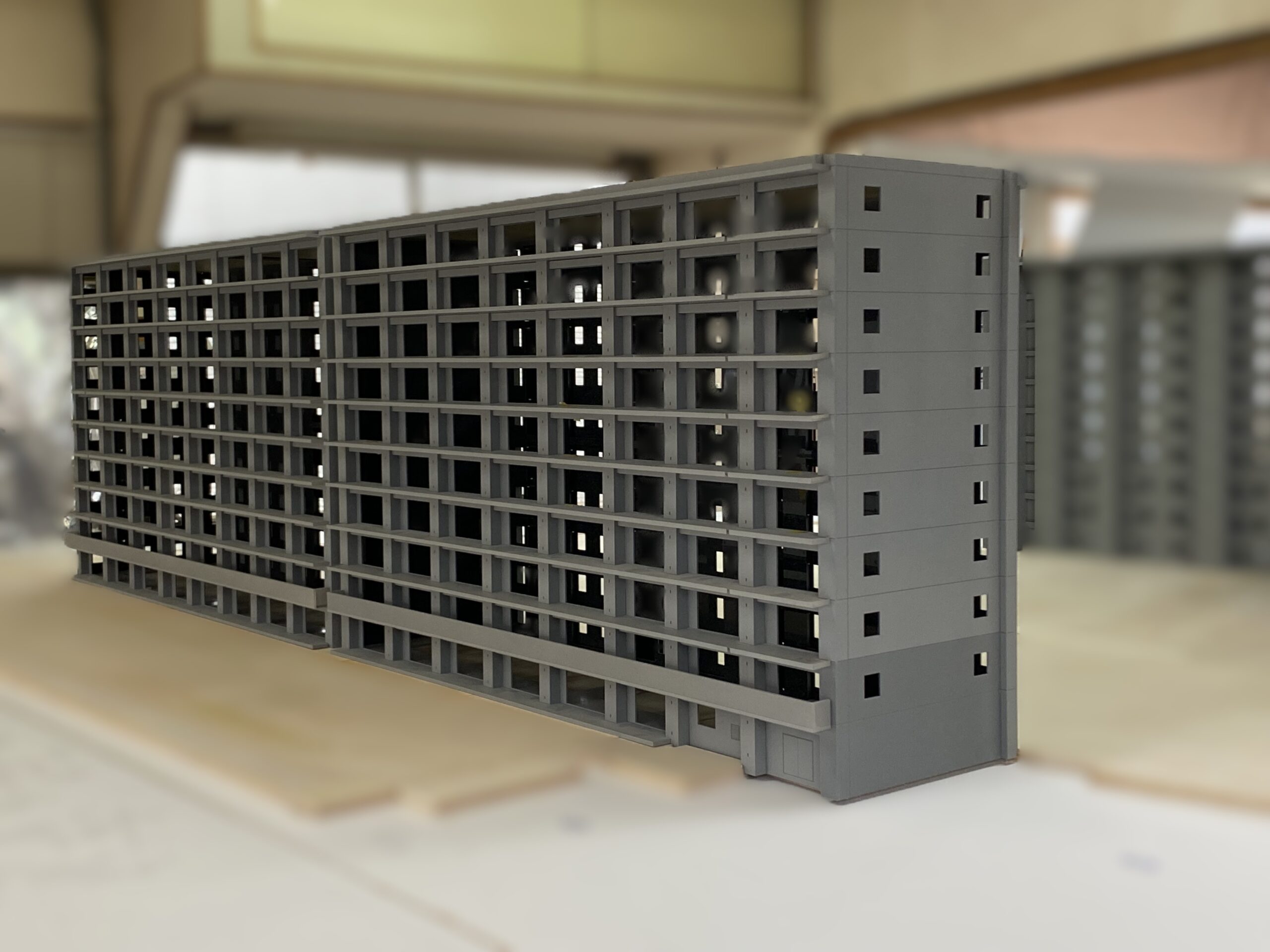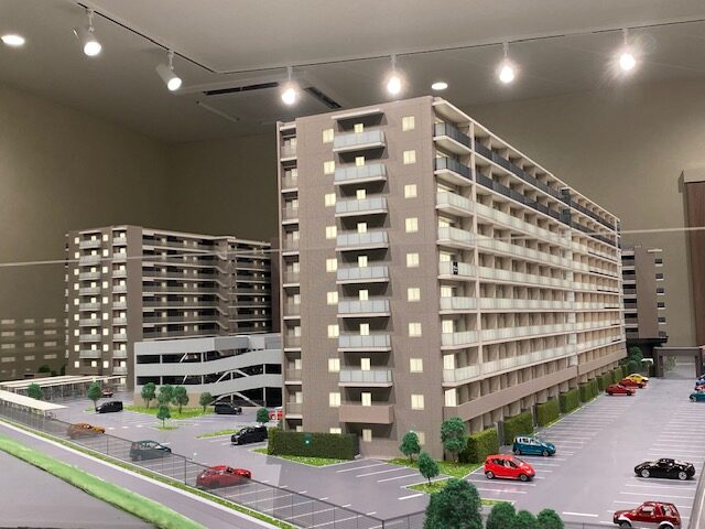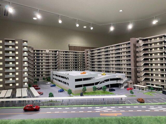 多棟・自走式立体駐車場のある大規模マンションの模型です。